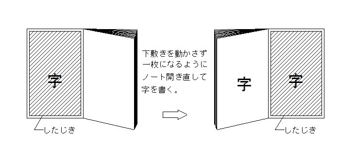 その下敷きを動かさずに、下敷きをちゃんと下にして、両側の紙に字を書いてください。
